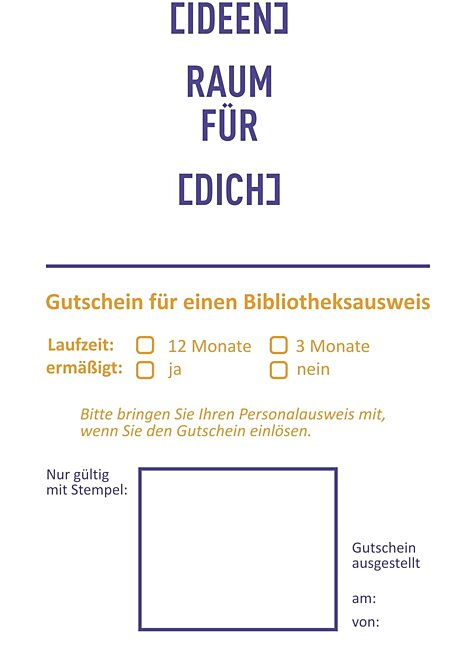 Der Gutschein ist jederzeit während der Öffnungszeiten der Stadtbibliothek an der Service-Theke erhältlich.